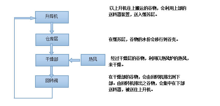 上升機往上搬運的谷物,會利用上部的送料器裝置,送入緩蘇層。 在緩蘇層,谷物的水份會移行到谷殼。經過干燥層的谷物,利用以熱風爐加熱的熱風,來干燥。在干燥部的谷物,會由回轉機排出到下部。由回轉機排出之谷物,會集中在下部送料器,被送往上升機。